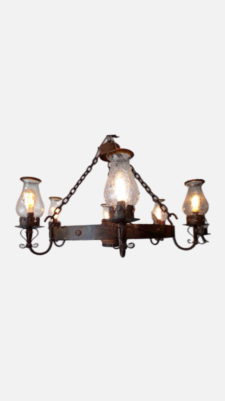 Rueda de madera con seis luces, ideal para espacios amplios.